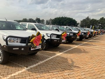 The distribution, carried out at the Kololo Independence Grounds, saw 69 double-cabin pickup trucks and 1,034 motorcycles handed over to district local governments under the Uganda Climate Smart Agricultural Transformation Project.