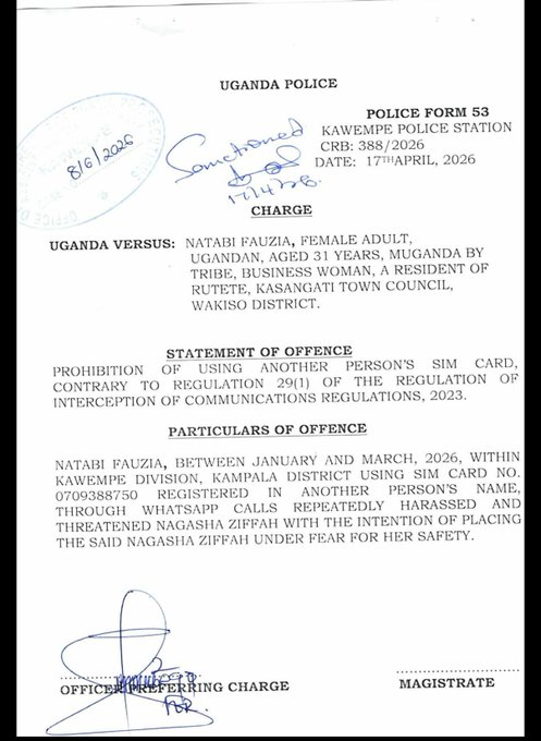 KAMPALA, Uganda — Natabi Fauzia, the wife of a personal assistant to opposition figure Bobi Wine, has been formally charged in court after spending more than a month in detention, sparking concern among lawyers and rights advocates.