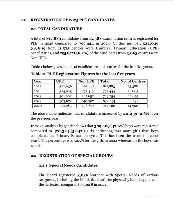 A total of 817,883 candidates from 15,388 examination centres registered for the 2025 PLE, an increase from 797,444 candidates in 2024. Of these, 522,036 candidates (63.8 percent) from 11,525 centres were beneficiaries of Universal Primary Education (UPE), while 295,847 candidates (36.2 percent) from 3,863 centres were non-UPE candidates.