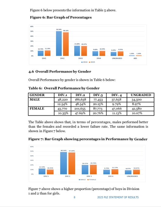 The Uganda National Examinations Board (UNEB) has released the results of the 2025 Primary Leaving Examination (PLE), revealing that male candidates performed better than females and registered a lower failure rate.