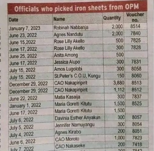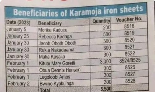 The document, widely shared on social media, appears to be a reproduction of an official record or media report. It outlines names, dates, and voucher numbers tied to the distribution of iron sheets that were originally procured under a government program intended to support vulnerable communities in the Karamoja sub-region.