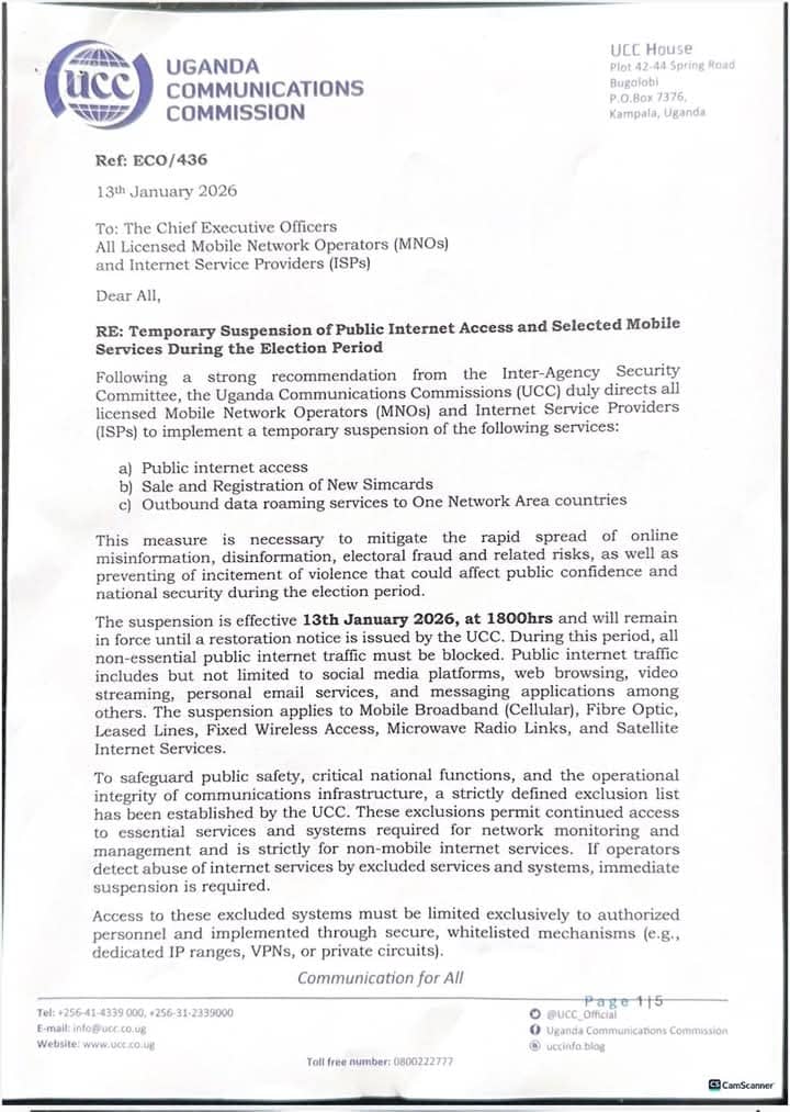 The Uganda Communications Commission (UCC) has ordered a nationwide shutdown of public internet access effective today, January 13, 2026, at 6:00 p.m..