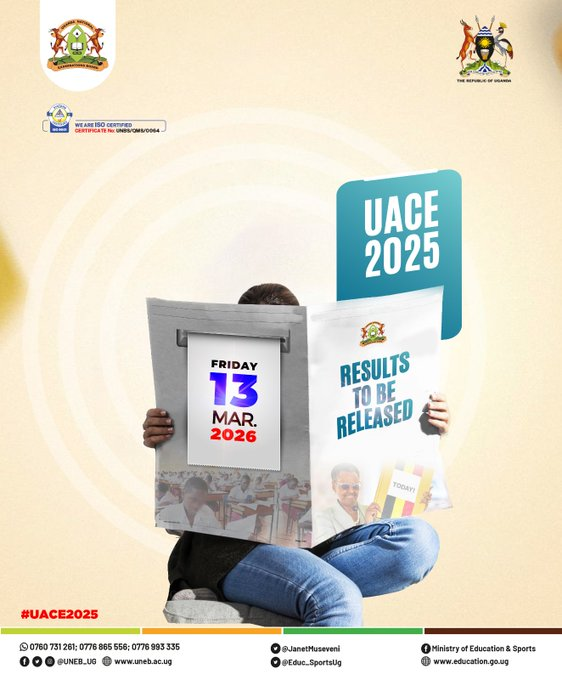 “The Uganda Advanced Certificate of Education (UACE) results for 2025 will be released on Friday, 13th March 2026 at 11:00 AM at State House Nakasero,” UNEB confirmed.